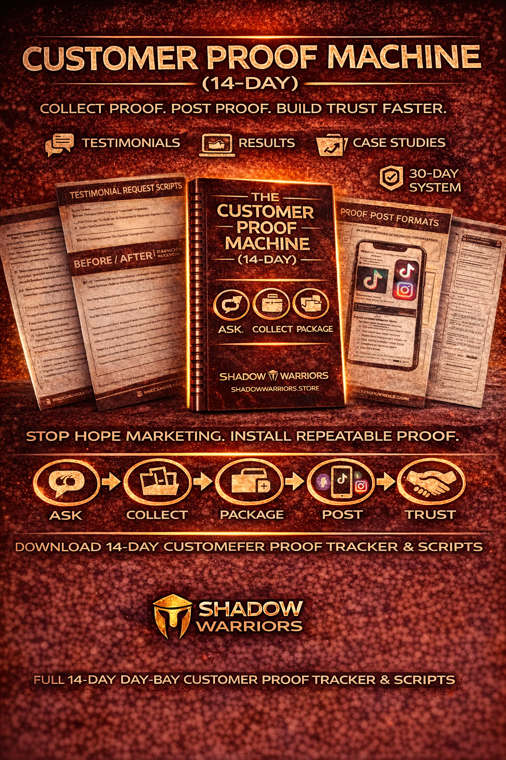 CUSTOMER PROOF MACHINE is a 14-day Shadow Warriors curriculum that helps you collect, package, and post proof consistently—so customers trust you faster and you stop relying on “hope marketing.”