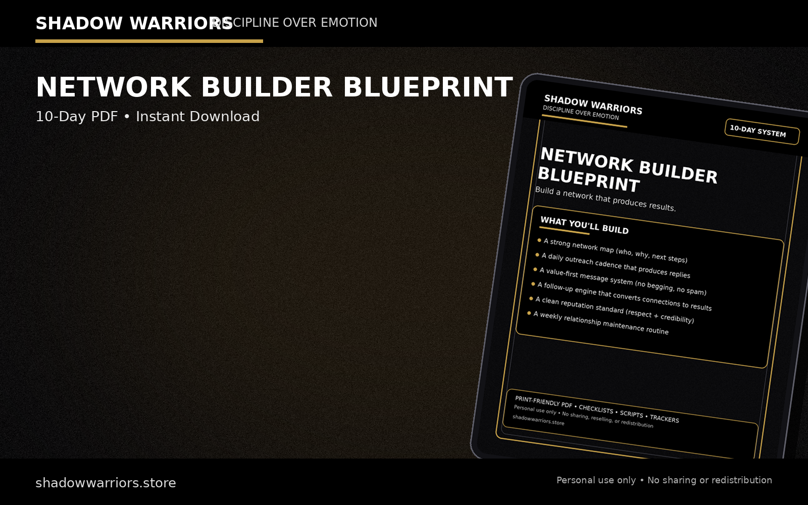 NETWORK BUILDER BLUEPRINT is a 10-day execution system that helps you build a real network—without begging, spamming, or “fake” energy. You’ll create a repeatable outreach and follow-up routine that turns connections into conversations, partnerships, and results.